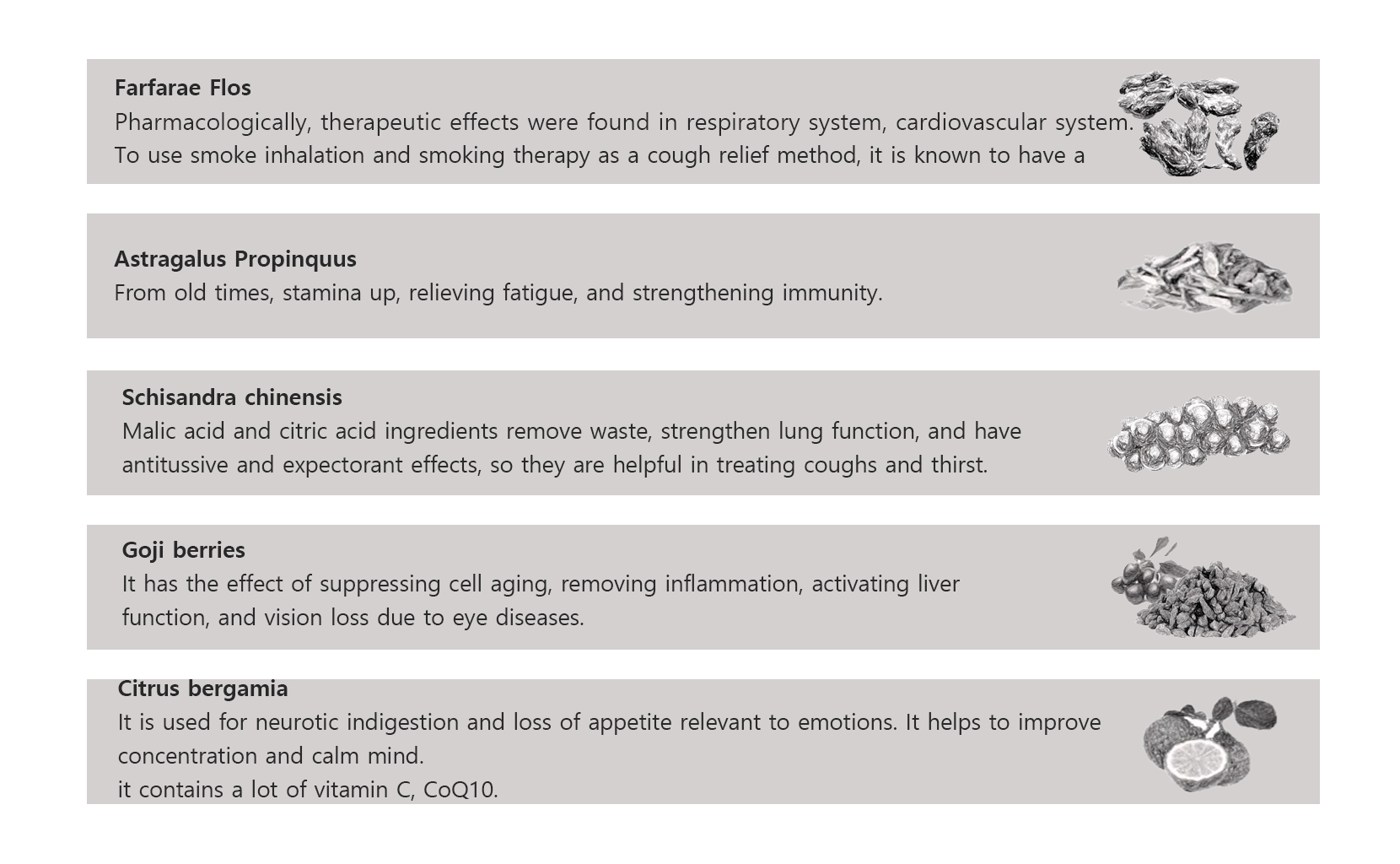 (Farfarae Flos, Schisandra chinensis, Goji berries,Astragalus Propinquus,Citrus bergamia )